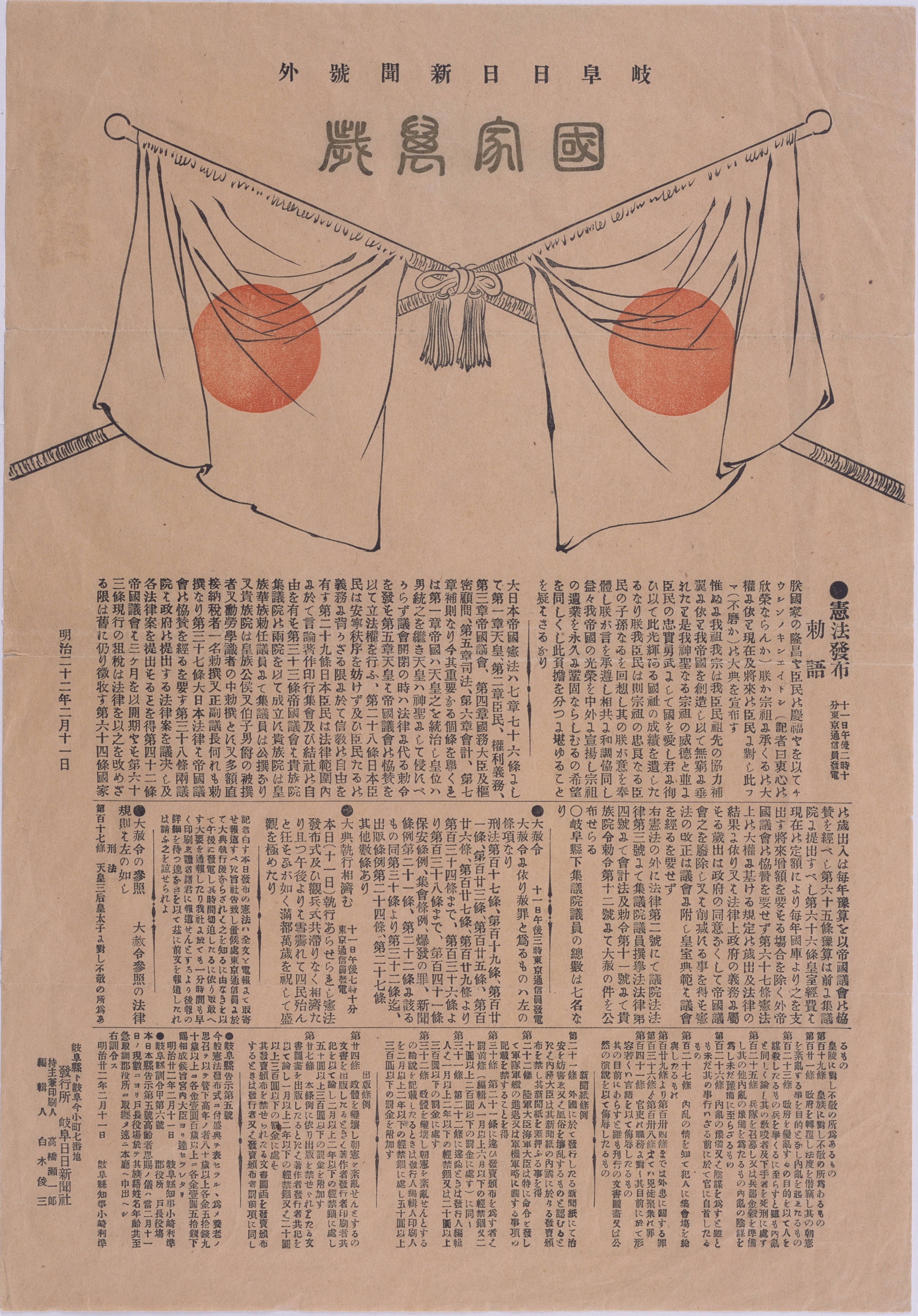 この史料は、憲法公布日に出された「岐阜日日新聞号外」である。これには、勅語や、大赦令、大典執行が滞りなく済んだこと、新聞紙条例、出版条例等が記されている。また、岐阜県からも7名の集(衆)議院議員が選出されたことを紹介している。