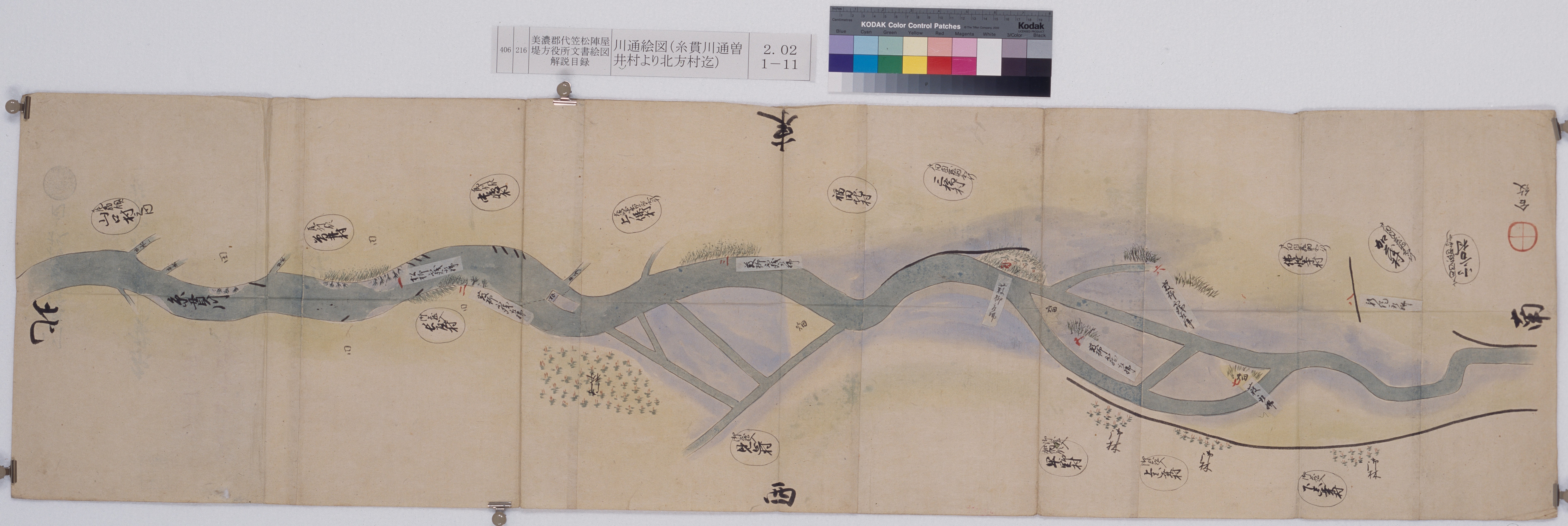 | 年月日未詳 | 長良川通楡俣村より小藪村迄水行普請絵図(43×189) | 1葉 | 2.02-23-9 |