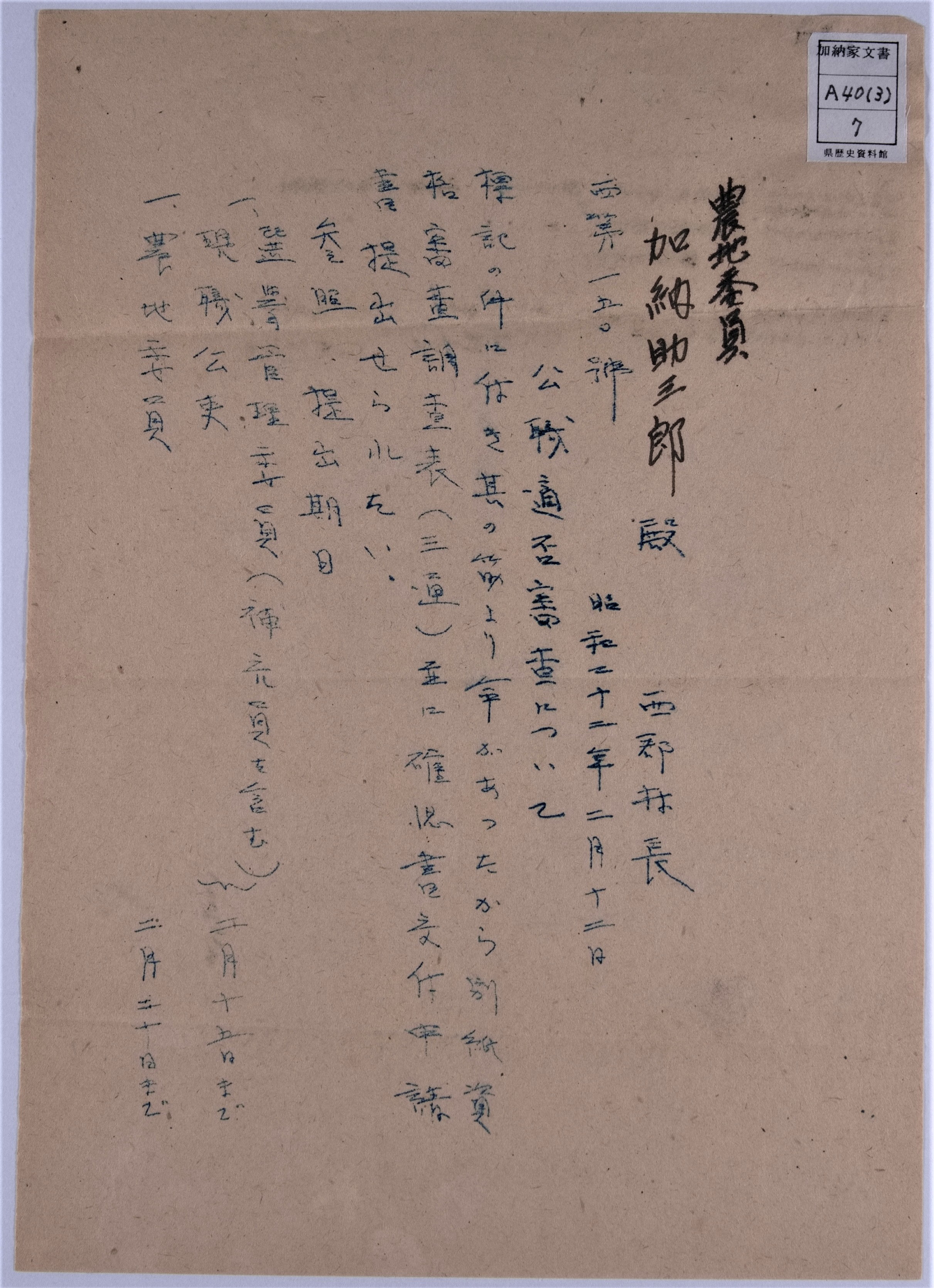 これを受けて、西郡村(揖斐川町・大野町)の村長から農地委員に対し、公職適否審査のため、資格審査調査表等の提出を求めたもの。