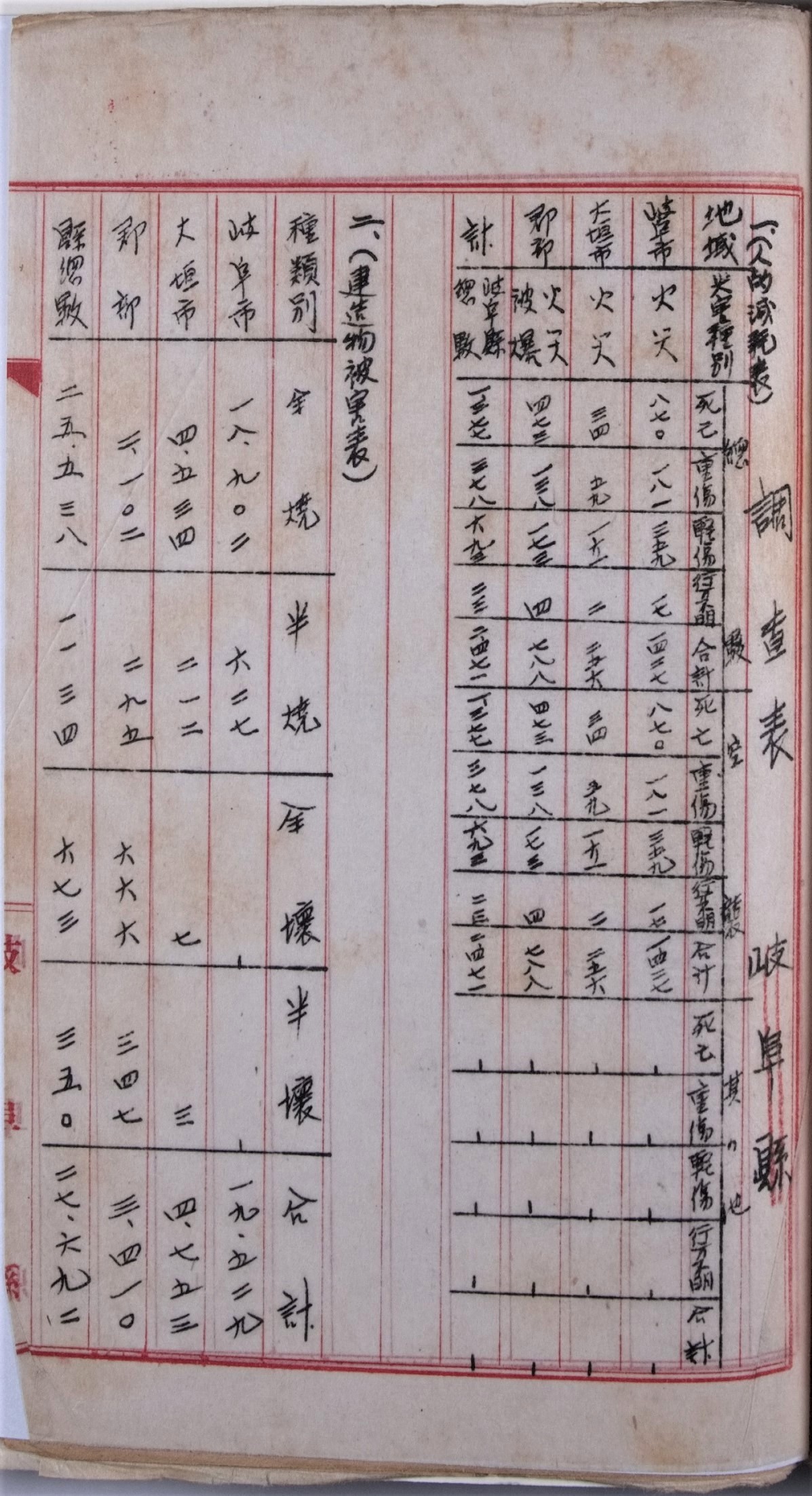 岐阜市、大垣市、郡部に分け、人的被害と建造物被害を集計している。被害はいずれも空襲によるもので、死者だけで1,377人を数える。