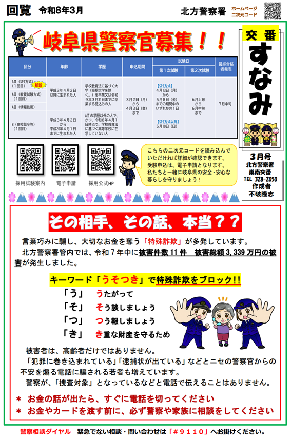 【北方警察署】巣南交番 ミニ広報紙 令和8年3月号発行