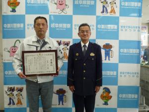 に対し、中津川警察署長より署長感謝状を贈呈しました。